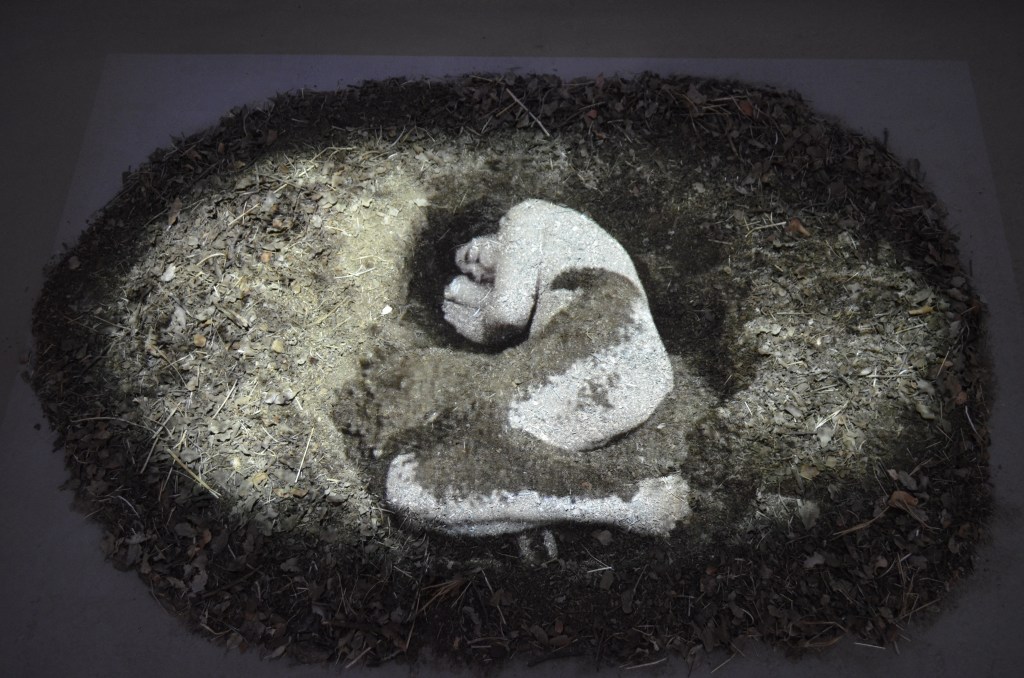 Bajo la frase del himno “La copia feliz del edén” se acusa el aún vigente vínculo entre estado y religión, siendo esta última un elemento sigiloso en el proceso de aculturación de las primeras naciones. Esta hegemonía es evidenciada en la narración de la creación del Génesis realizado por mi abuela María Melivilú, quien como muchas personas de origen mapuche, ha incorporado este relato cristiano a su imaginario. En el relato aparecen conceptos como la subordinación de la mujer ante el hombre y las consecuencias de la desobediencia. El relato acompaña el registro de una acción realizada en Temuco, donde se observa cómo el cuerpo de la artista es enterrado bajo tierra, quedando completamente cubierto en el que se aprecia cómo la respiración mueve el terreno donde antes veíamos el cuerpo, ahora oculto. El video es puesto en reversa y el entierro es deshecho, quedando el cuerpo nuevamente descubierto, haciendo referencia al mal llamado “descubrimiento” por los españoles.