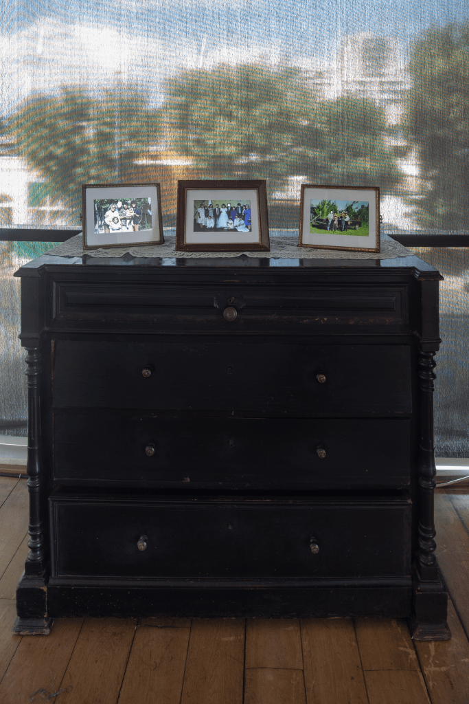 Texto por Vania Montgomery: La obra de Paula Coñoepan nos presenta un mueble hogareño que sobrevive a varias generaciones de la familia de la artista, sobre el cual reposan tres fotografías que han sido recompuestas: allá donde antes permanecía siempre el mismo sujeto, honrado en el silencio del calado de su rostro, hoy se reduce aquella falta en la medida en que Coñoepan desarticula al resto de quienes aparecen en las imágenes, dejando en entredicho si lo que vemos son facciones restituidas a su semblante original o fragmentos que se disgregan de este para dar forma al resto de los integrantes, portadores del secreto que dio origen a su borradura.
