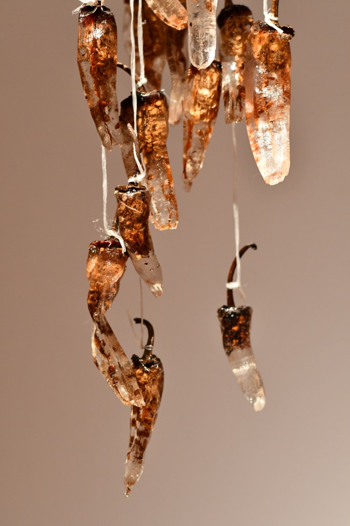 Anatomía del chile plantea un vínculo entre lo vegetal, lo humano y el territorio. Esta conexión recoge características en común de estos tres elementos, siendo las más reconocidas la forma, la pertenencia y la fragilidad. Esta caracterización busca ir desde lo formal a lo conceptual para explorar nociones identitarias, las cuales están presentes en la obra. A través del proceso del vaciado, se convirtió cada ají en una matriz para develar la profundidad de su estructura, materializando el vacío de su interior en resina transparente. La trenza contiene además, un híbrido entre planta y cuerpo: formas de dedos que comparten un interior en común con los ajíes, mimetizando sus formas delgadas y alargadas. Estas características, también pertenecen a la forma del territorio nacional, entablando una equivalencia entre Chile y Ají. La trenza del ají cacho de cabra es un elemento característico de la zona sur y rural, presente en la cocina mapuche para la elaboración del merkén, siendo vaciada de su componente más característico en esta obra: su olor y color. En el mismo sentido, la fragilidad de la resina encapsula sus semillas imposibilitando su reproducción biológica, volviendo su forma fálica en estéril.