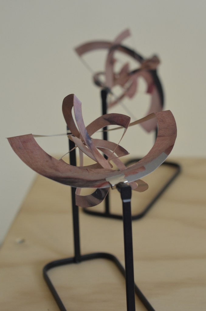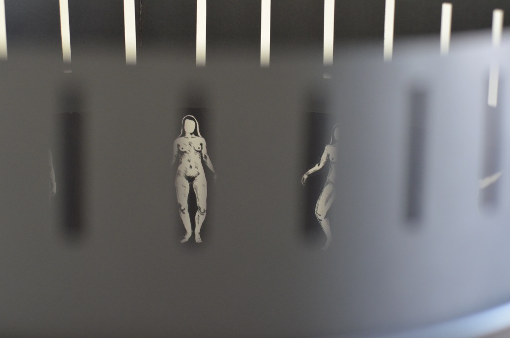 Las obras que tienen un carácter más instalativo buscan remitir al periodo de la infancia, ya que su construcción se debe en parte a los artificios que juegan con la percepción para crear una ilusión a través de la entretención y el descubrimiento. “Auto reproducción infinita” (2015) es una animación en loop reproducida en un zootropo, con el cual los espectadores de la muestra podrán interactuar y activar. En esta animación se puede observar cómo un cuerpo femenino da a luz, consumiéndose a sí mismo en el acto. Por su parte, la obra “Ascendencia” (2021) es una serie de fotografías de retratos de mi abuela, madre y yo, intervenidas con la técnica de kirigami circular. De esta manera, los rostros se funden y entremezclan entre sí, en un soporte de papel que genera memoria del doblez y que le permite girar sobre sí mismo.